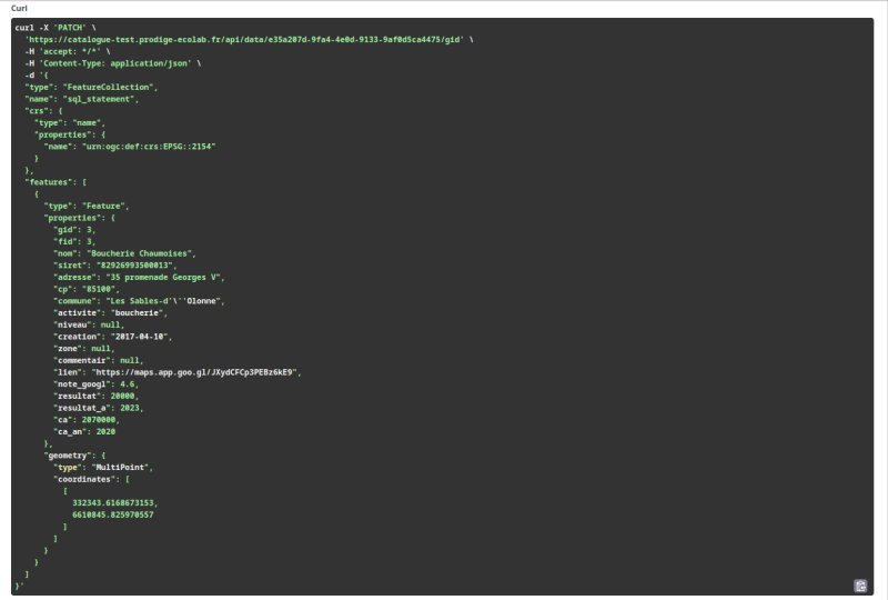 Le contenu des données ajoutées est envoyé dans la payload au format geojson.